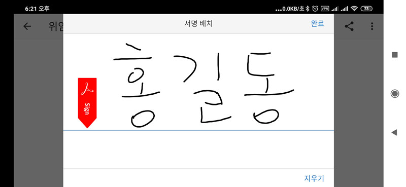 파일을 불러왔으면 우측 상단의 펜 모양 아이콘을 터치해 '서명 만들기'를 선택하자. 그러면 사용자가 직접 서명을 그릴 수 있는 작업창이 뜬다. 여기에 손가락이나 터치펜으로 직접 자신의 서명을 그린 후 '완료'를 누르면 우측 상단 서명 만들기 메뉴에 해당 서명이 등록된다.