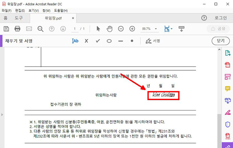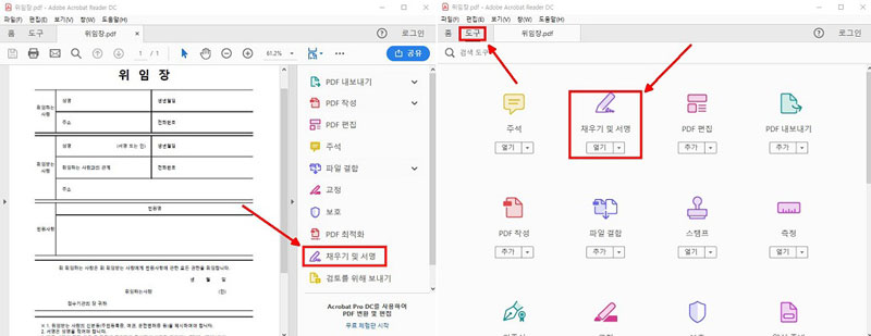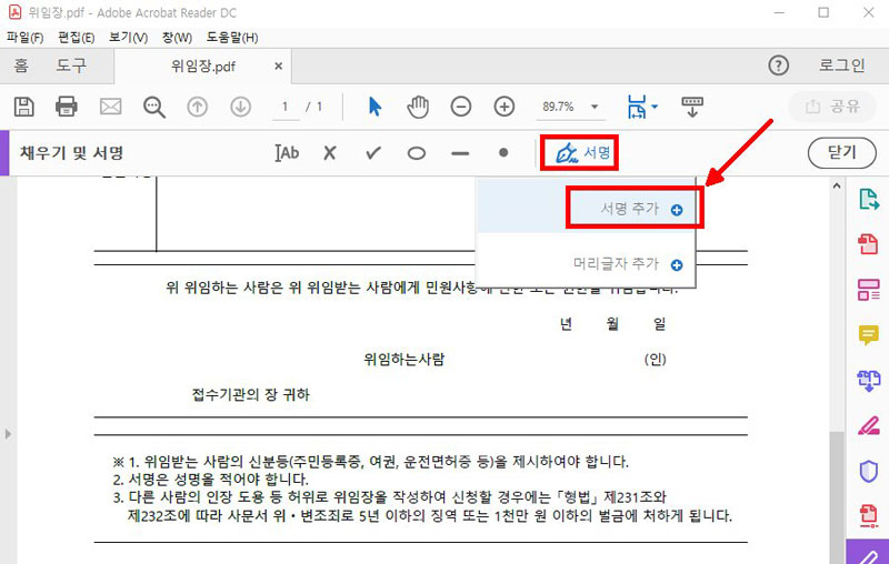 <우측 바로가기 메뉴나 상단 도구 탭을 통해 '채우기 및 서명'을 활성화하자>