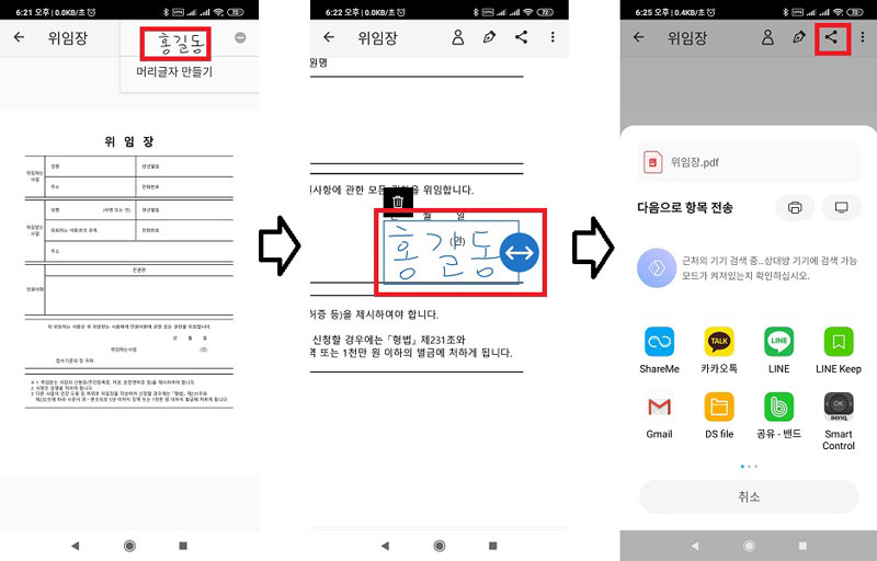 이렇게 만들어진 서명을 선택해 해당 문서의 원하는 곳에 배치하자. <-> 도구를 통해 서명의 크기도 조절할 수 있다. 서명 작업이 끝난 PDF 문서는 자동으로 저장되며 어도비 필&사인 앱의 공유 기능을 통해 다른 곳으로 전송하거나 인쇄하는 것이 가능하다. 고가의 PDF 편집용 앱, 혹은 프린터나 스캐너 없이도 간편하게 서명을 할 수 있으니 PDF 문서를 다룰 일이 많은 사용자라면 적극적으로 이용해 볼 만하다.
