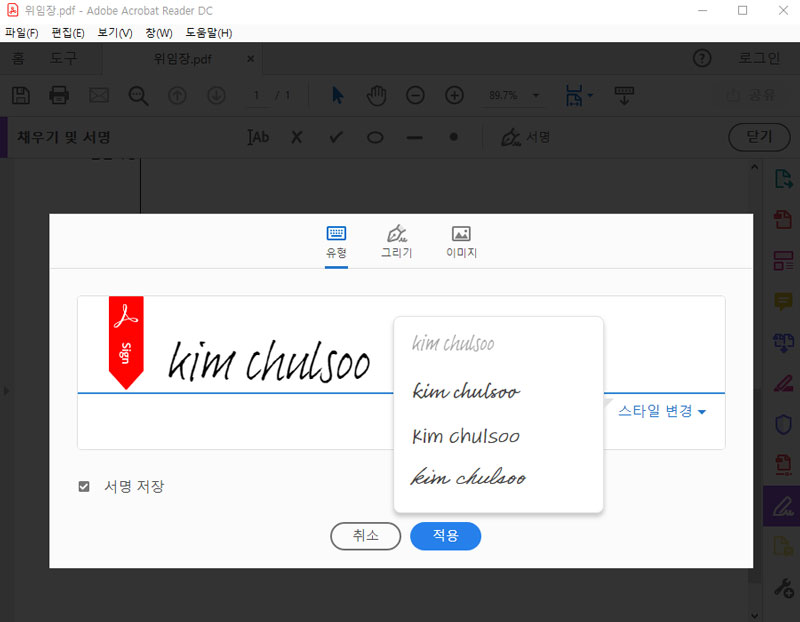 그러면 직접 서명을 그리는 과정이 시작된다. 상단의 '유형' 탭을 선택하면 키보드 입력으로 서명을 하게 된다. 우측 하단의 '스타일 변경' 메뉴를 통해 필기체 효과를 줄 수 있는데 아쉽게도 한글은 필기체 효과가 지원되지 않는다. 한글로 서명을 하려면 '그리기' 탭을 이용하는 것을 추천한다. 이 기능을 선택하면 마우스로 직접 서명을 그릴 수 있다.
