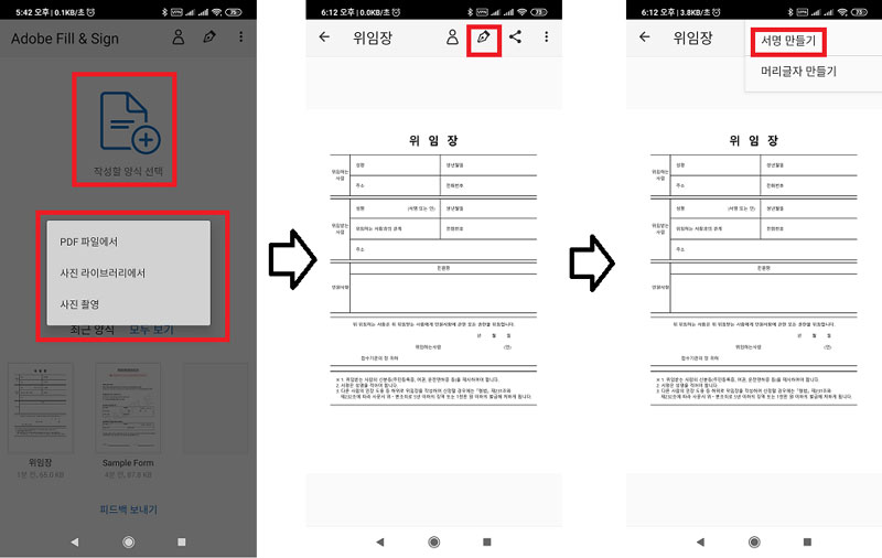 모바일 환경에서 PDF 문서에 서명을 할 때 가장 무난하게 쓸 수 있는 건 '어도비 필&사인(Adobe Fill & Sing)' 앱이다. 구글 플레이나 애플 앱 스토어를 통해 무료로 다운로드 가능하다. 어도비 필&사인 앱을 실행한 후 '상단의 작성할 양식 선택' 메뉴를 터치해 보자. 시스템 내에 저장된 PDF 파일, 혹은 이미지 파일(사진 라이브러리)을 불러올 수 있으며 실제로 있는 종이 문서를 사진 촬영해 서명을 추가하는 것도 가능하다.![]() |