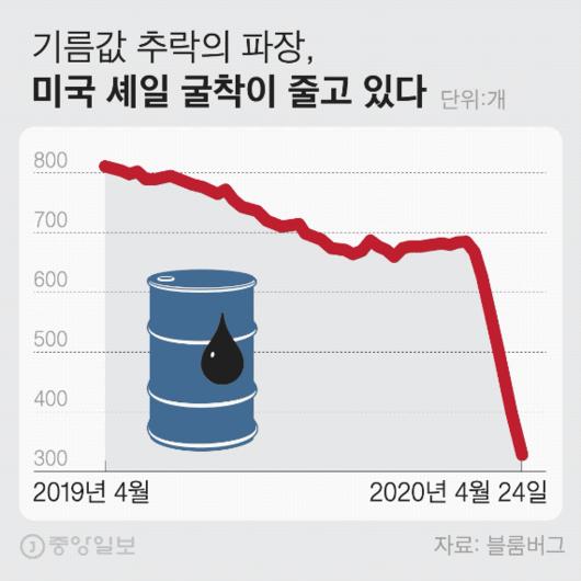 도널드 트럼프 미국 대통령의 압박이나 조율은 필요 없다. 기름값이 떨어지니 시장의 원리에 따라 미국 셰일회사들이 유전을 닫고 있다. 4월24일 현재 미국 원유 굴착기(rig)의 가동이 한 주 전과 견줘 14% 줄었다. 최근 7주의 흐름을 보면 굴착장비 절반 이상이 가동을 멈췄다. 굴착기 가동건수(rig count)는 국제원유 시세를 가늠할 때 중요한 지표다.