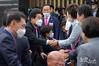미래통합당 심재철 원내대표 겸 당대표 권한대행이 8일 국회에서 열린 2020년 원내대표 및 정책위의장 선출을 위한 당선자총회에서 당선인들과 인사하고 있다.