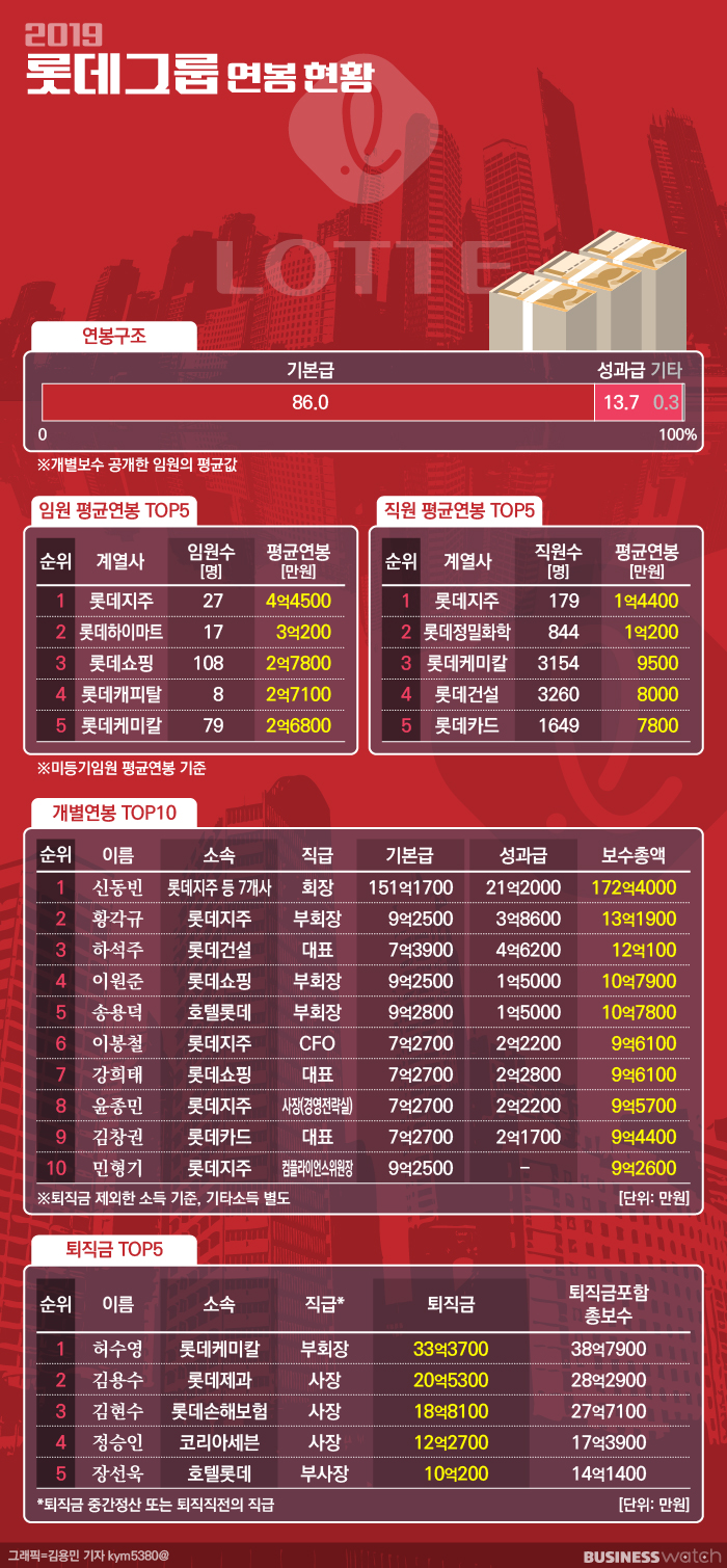 40명 임원의 지난해 연봉내역을 종합하면 롯데그룹의 연봉 구조는 기본급 86%, 성과급 13.7%, 기타 0.3%로 이루어져있다. 5대그룹(삼성, 현대차, SK, LG, 롯데) 가운데 기본급 비중이 가장 높다.