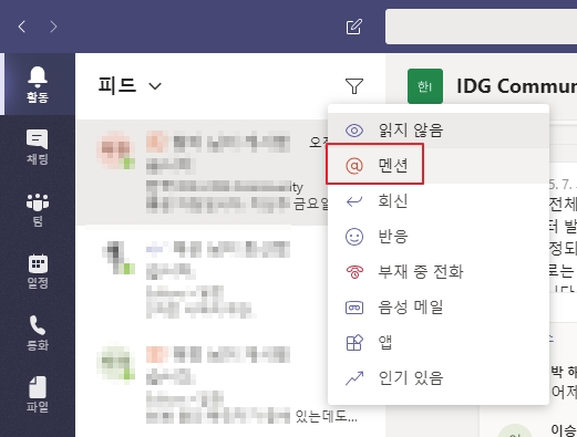 왼쪽 탐색바에서 ‘활동’을 클릭하고, 활동 창 상단 오른쪽에 있는 필터 아이콘을 오른쪽 클릭하고, ’@멘션’을 클릭한다. 또는 팀즈 상단의 ‘검색어 입력’란에 /mentions을 입력한다. 본인이 태그된 채팅이나 대화가 바로 표시된다.![]() |
