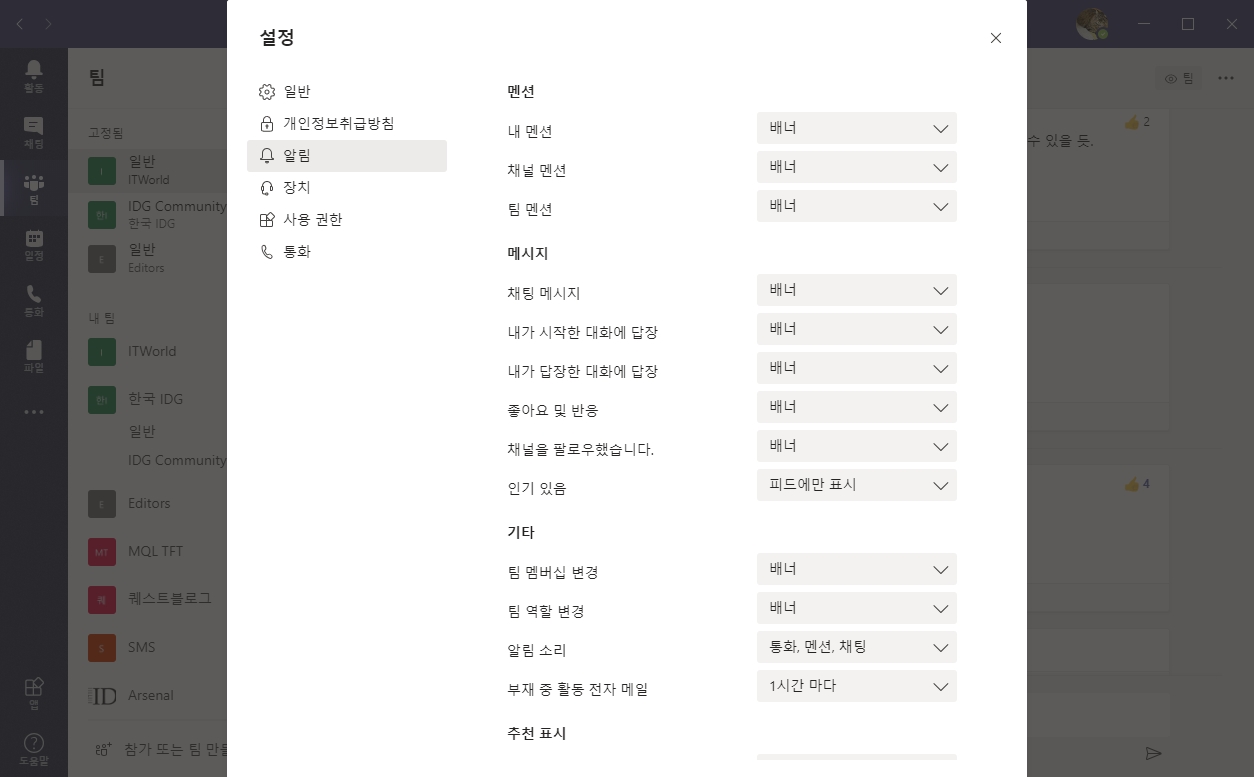 특정 채널에서 무슨 일이 일어나고 있는지 계속 추적해야 한다면, 새로운 활동이 있을 때마다 알림을 받는 것을 선택할 수 있다. 이렇게 하려면 팀즈 열에서 커서를 채널 이름 위로 이동하고 오른쪽에 있는 3점 아이콘을 클릭한 다음 열리는 메뉴에서 ‘채널 알림’을 클릭하면 된다.‘채널 알림 설정’ 화면이 나타난다. 여기서 새로운 메시지가 채널에 게시될 때마다 알림을 받을지 또는 팀원이 채널을 언급할 때마다 알림을 받을지 여부를 설정할 수 있다. 알림을 켜면 ‘배너 및 피드’에서 또는 ‘피드에만 표시’를 통해서만 알림을 받고 싶은지를 지정할 수 있다.