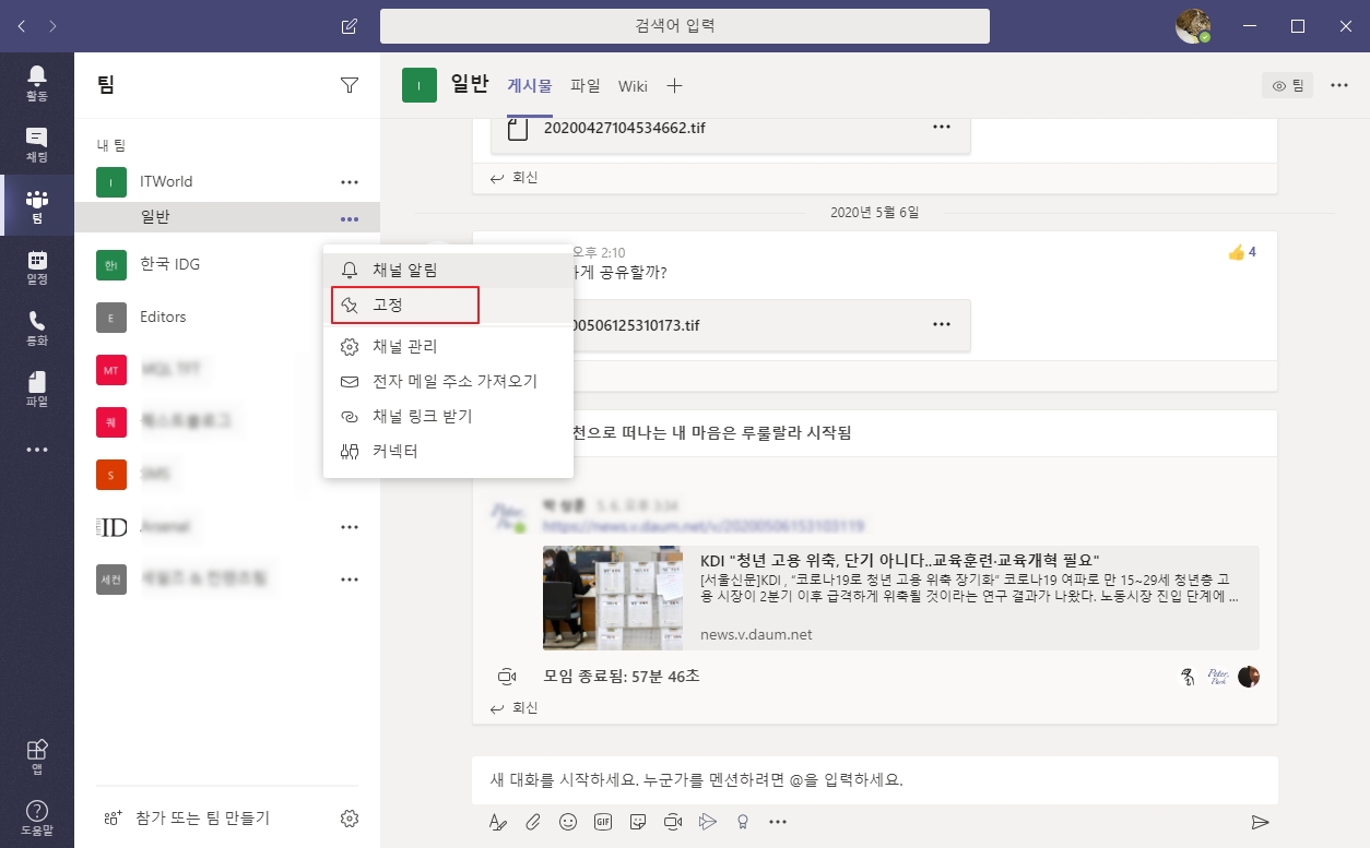 앱 왼쪽의 탐색 바에서 팀 아이콘을 클릭하면, 본인이 속한 팀이 각 팀과 각 팀의 채널이 팀명 아래에 표시된다. 기본적으로 팀과 채널은 본인이 참여하거나 만든 순서대로 나타나지만, 더 중요한 채널과 그렇지 않은 채널이 있을 것이다. 꼭 정해진 순서대로 둘 필요는 없다.채널을 ‘고정’하면 더 많이 눈에 띄고 더 빨리 액세스할 수 있도록 창 위쪽에 놓이게 된다. 이렇게 하려면 채널 이름 옆에 오른쪽 3점 아이콘을 클릭하고 ‘고정’을 선택한다. (채널의 고정표시를 취소하려면 이 과정을 다시 하면 된다.)