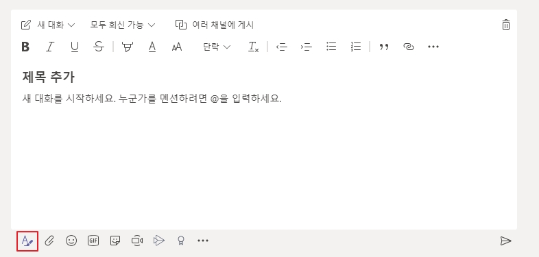 수많은 메시지 중에서 채팅 메시지가 두드러지도록 돕는 또 다른 방법은 제목을 붙이는 것이다. 제목을 붙이면 눈에 띄기도 하지만, 나중에 검색 상자에서 제목으로 검색해서 해당 메시지를 찾을 수도 있다. 물론 모든 채팅 메시지에 제목을 붙일 필요는 없다. 추적해야 할 가장 중요한 메시지에 제목을 붙이는 것이 가장 좋다.작성 중인 채팅 메시지에 제목을 추가하려면 텍스트 입력 필드 아래의 도구 모음 왼쪽 끝에 있는 서식 아이콘(그림 브러시가 위에 달린 ‘A’처럼 보인다)을 누른다. 메시지 창이 확장될 것이다. ‘제목 추가’라는 행에 제목을 입력한 다음 아래에 메시지를 입력한다. 메시지 창의 오른쪽 아래에 있는 ‘보내기’ 화살표를 눌러 새 제목으로 채팅을 게시한다.