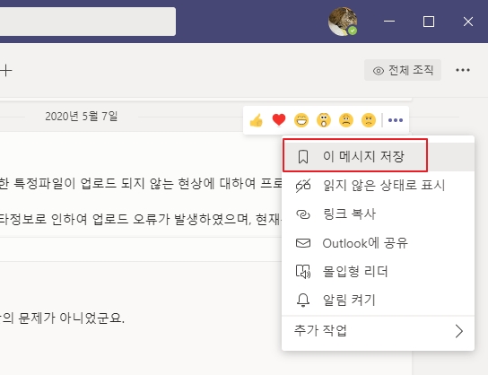 대화 중 놓치고 싶지 않거나 나중에 참조하고 싶을 때 유용한 기능이다. 저장하고 싶은 메시지의오른쪽 상단 3점 아이콘을 클릭한 다음 ‘이 메시지 저장’을 선택한다. 저장된 채팅 메시지 목록을 보려면 앱 오른쪽 상단에 있는 프로필 이미지를 클릭하고 ‘저장됨’을 선택하거나, 상단의 검색란에 ‘/saved’를 입력한다. 저장된 채팅 메시지가 피드에 나타난다. 파일을 다운로드할 필요 없이 나중에 봐야 할 중요 문서와 같이 첨부 파일이 있는 채팅 메시지를 저장하는 데 유용하다.