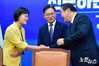 정의당 배진교 신임 원내대표(가운데)와 강은미 원내수석부대표(좌측)가 12일 국회에서 더불어민주당 원내대표실을 찾아 김태년 원내대표와 인사를 하고 있다.