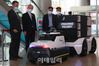 [이데일리 노진환 기자] 최기영(왼쪽 두번째) 과학기술정보통신부 장관이 13일 오전 서울 중구 중앙우체국 로비에서 만도의 자율주행 순찰 로봇(앞)과 언맨드솔루션의 자율주행 배달 로봇을 시연하고 있다.
