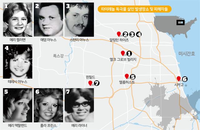 직업도, 연령대도 제각각인 7인의 죽음에 공통분모는 없을 듯 보였다. 그러나 수사에 착수한 경찰은 얼마 지나지 않아 두 가지 연결고리를 찾아냈다. 사망자 모두 숨지기 직전 타이레놀을 섭취했다는 것, 그리고 독성물질인 ‘시안화물’이 시신에서 검출된 것이다. 우리가 흔히 ‘청산가리’로 부르는 그 독극물이다. 그것도 치사량의 1만배에 달하는 65㎎이 캡슐에 들어 있었다.