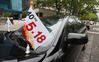 16일 오후 서울 여의도 금융감독원 앞에서 열린 '모이자 연희동으로! 전두환은 사죄하라!' 5·18 드라이브스루' 집회에서 차량에 깃발이 걸려있다. 연합뉴스 |
