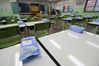 지난 15일 오전 서울 동작구 보라매초등학교 6학년 1반 책상에 학생들의 등교 개학 준비를 위한 물티슈가 올려져 있다. 연합뉴스 |