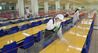 고등학교 3학년 학생들의 등교 개학을 이틀 앞둔 18일 서울 은평구 선정고등학교 급식실에서 학교 관계자들이 밀접 접촉 방지용 투명 칸막이를 소독하고 있다. 하상윤 기자 |