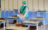 고3 학생들의 등교를 하루 앞둔 19일 오후 서울 영등포구 여의도여고에서 새마을지도자영등포구협의회 관계자가 고3 학생들의 교실 방역 작업을 하고 있다. 연합뉴스 |