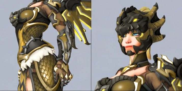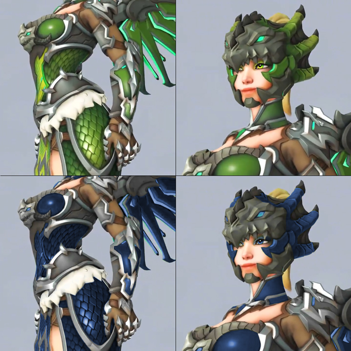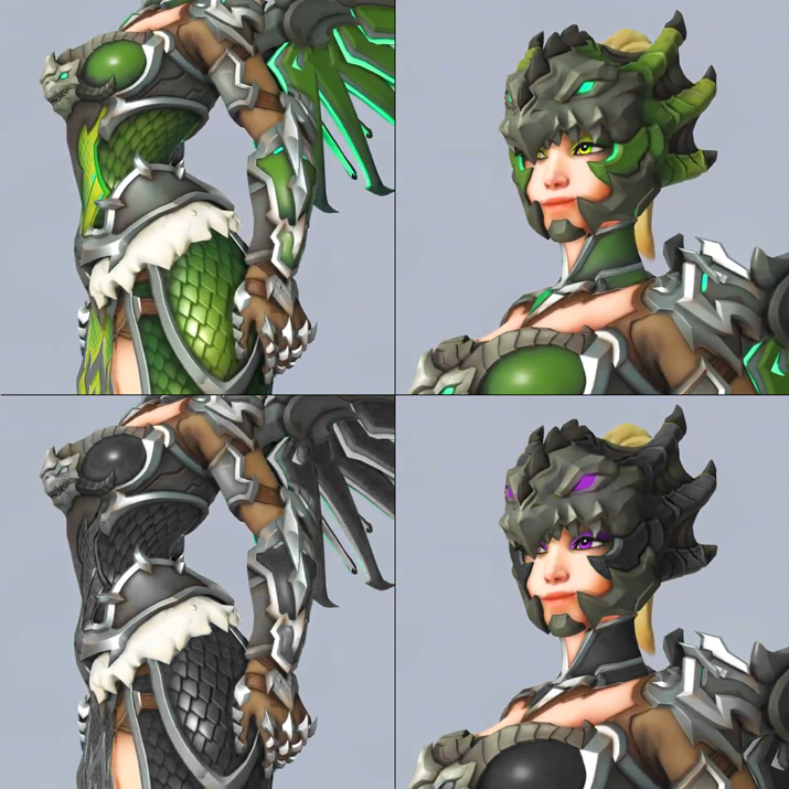 이 중 화제로 떠오른 것은 지난 18일에 오버워치 공식 SNS를 통해 소개된 ‘용기수 메르시’다. 이 전설 스킨은 용 혹은 드래곤을 테마로 하고 있는데 전체적으로 스킨 색상이 초록색이다. 이에 대해 해외 커뮤니티 사이트 레딧(Reddit)에는 이번에 공개된 용기수 메르시 스킨 색상을 바꿨으면 좋겠다는 의견과 함께 팬들이 작업한 결과물이 올라오고 있다. 같은 갑옷을 검은색, 보라색, 금색, 붉은색, 파란색 등으로 바꾼 것인데 색만 달라졌음에도 인상이 확 달라졌음을 확인할 수 있다.