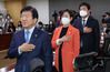 국회의장 후보인 더불어민주당 박병석(왼쪽) 의원과 김진표(오른쪽)이 19일 오전 서울 여의도 국회 의원회관에서 열린 ‘일하는 국회 어떻게 만들 것인가’ 간담회에 참석, 국기에 대한 경례를 하고 있다. 사진 가운데는 여성 최초로 국회 부의장에 도전하는 더불어민주당 김상희 의원(사진=연합뉴스) |