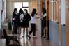 학생들은 하나로 줄인 입구에서 차례를 기다리며 체온과 건강 상태를 확인하고 학교 건물로 입장했다.