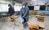 /김영근 기자 19일 고등학생 3학년 등교를 하루 앞두고 방역당국이 교실 방역작업을 하고 있다. |