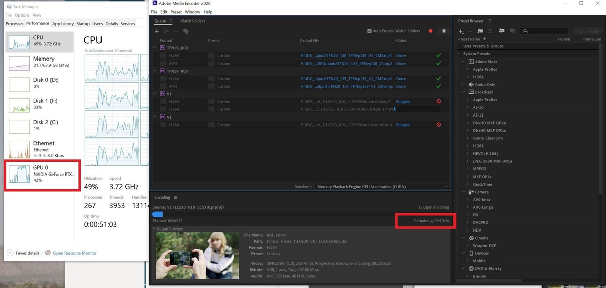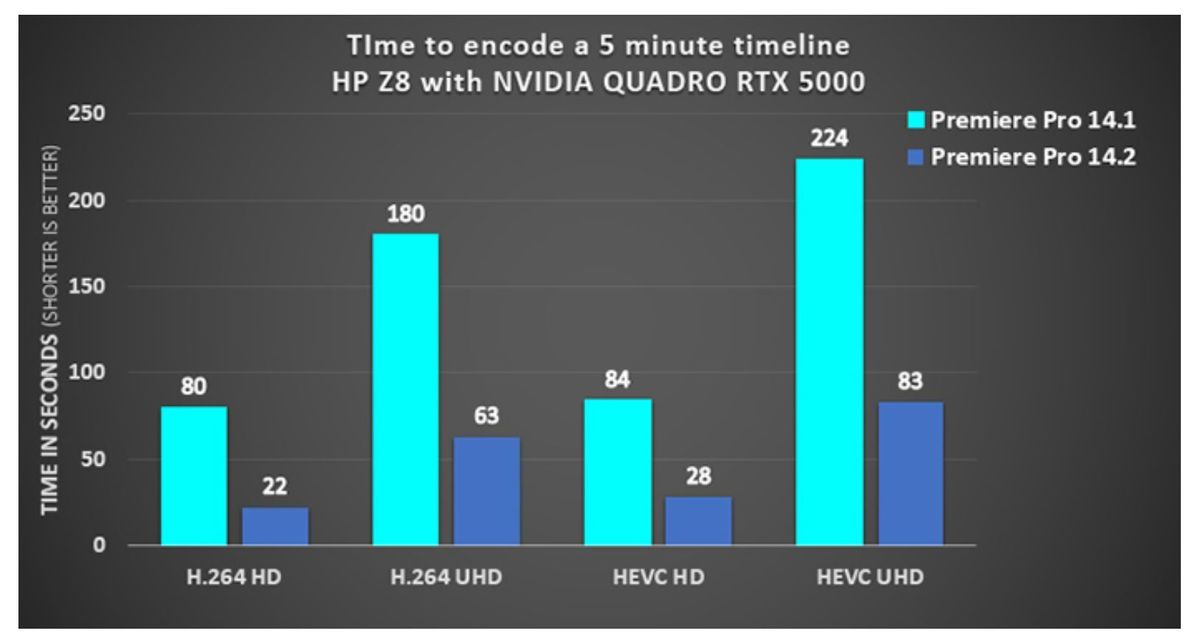 어도비와 엔비디아가 공개한 자료를 보면, 지포스와 쿼드로 GPU의 NVENC 하드웨어 인코더를 이용하면, CPU만으로 렌더링하는 것보다 5배 더 빠르게 영상을 출력할 수 있다. 이러한 성능 개선은 개별 작업에 따라 크게 차이가 날 수 있다. 예를 들어 PC월드의 선임 비디오 디렉터 아담 패트릭 머레이가 H.264 출력 성능을 테스트한 결과, 인텔 코어 i7-6900K와 지포스 RTX 2080 슈퍼를 사용한 시스템에서 GPU 인코딩 기능을 활성화하자 렌더링 시간이 절반으로 줄어들었다.