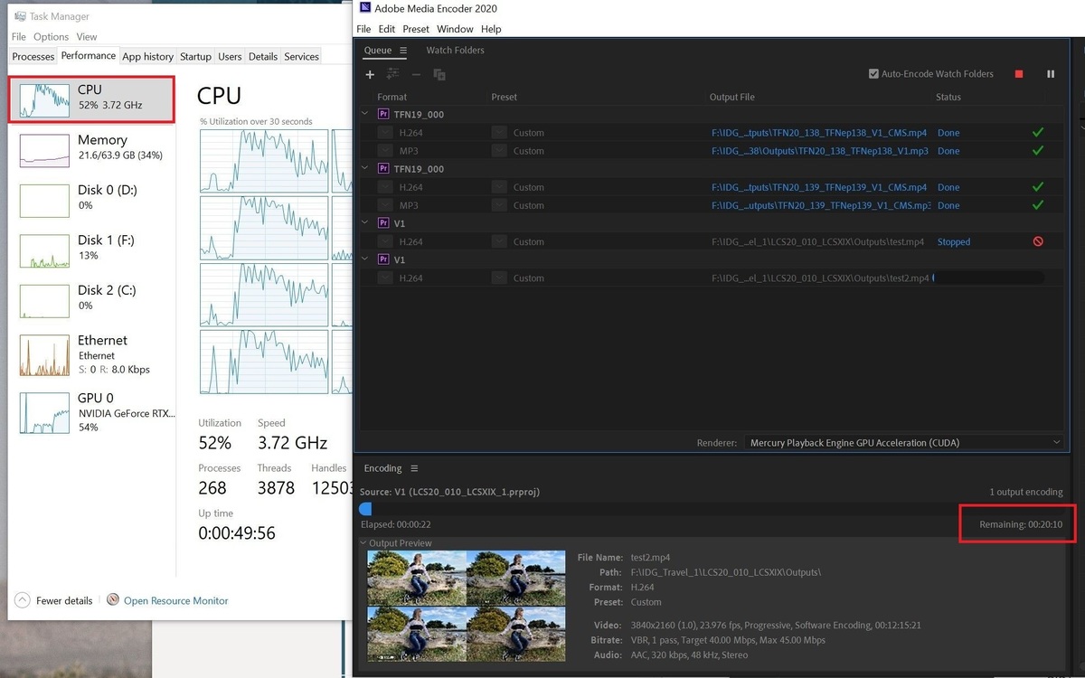 단, GPU 인코딩을 활용하면 선택할 수 있는 영상 품질이 제한된다. 아담에 따르면, 투 패스 VBR에서는 GPU 인코딩을 사용할 수 없고, 원 패스 VBR이나 CBR에서만 사용할 수 있다. 이 신기능을 다양하게 테스트하지는 않았지만, 이론적으로는 투 패스 VBR에 익숙한 이들이 이미지 품질이 떨어진 것을 느낄 수도 있다.