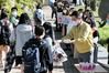 20일 아침 경북 포항 영일고 정문 앞에서 이강덕 포항시장이 등교하는 고교 3학년 학생들에게 손 소독제를 나눠주고 있는 모습. |