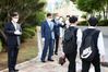 고3 학생 등교 첫날인 20일 오전 김병우 충북도교육감(왼쪽에서 두번째)이 청주 금천고에서 등교하는 학생들에게 손을 흔들고 있다./충북도교육청 |