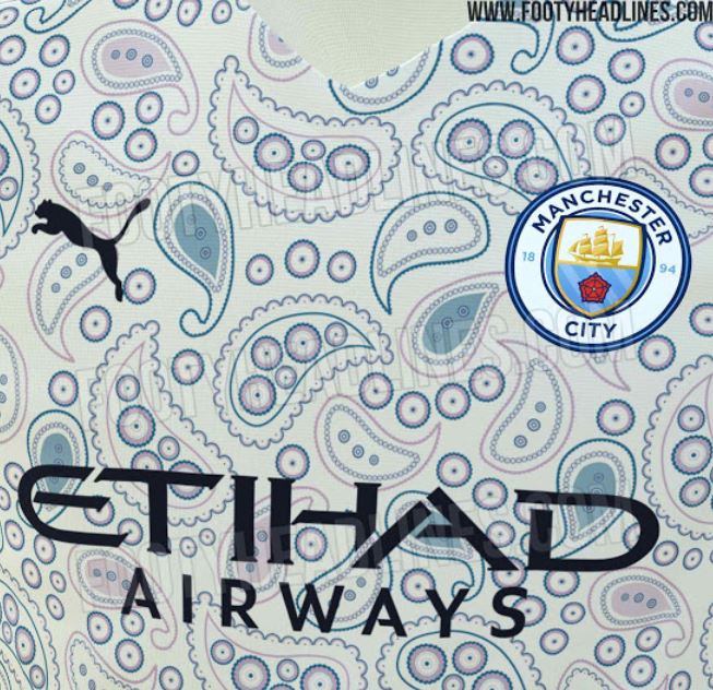 지난 시즌부터 맨시티 유니폼을 제작한 푸마는 맨시티의 새로운 써드 유니폼에 페이즐리 무늬를 반복적으로 넣었다. 페이즐리란 깃털이 휘어진 모양을 일컫는다. 멀리서 보면 크고 작은 물방울이 맺혀있는 것처럼 보인다. 주로 식탁보나 벽지 디자인으로 활용되는 패턴이다.