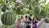24일 오후 달성군 옥포읍 시설 하우스에서 열린 가족수확체험에 참가한 한 가족이 주렁주렁 매달린 애플수박을 신기한 듯 바라보고 있다.(사진=뉴시스) |