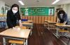 등교개학을 이틀 앞둔 25일 오후 대전 서구 둔산초등학교 1학년 교실에서 교사들이 책상을 소독하고 있다. 지난주 고3에 이어 오는 27일에는 고2, 중3, 초1~2, 유치원생의 등교 수업이 시작된다. 뉴스1 |