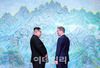 문재인 대통령과 김정은 북한 국무위원장이 2018 남북정상회담이 열린 경기도 파주시 판문점 평화의 집 북한산 그림 앞에서 대화하고 있는 모습(사진=한국공동사진기자단). |