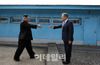 문재인 대통령과 김정은 국무위원장이 2018년 4월27일 판문점 군사분계선에서 인사를 나누고 있는 모습(사진=한국공동사진기자단). |