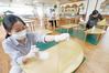 고2·중3·초1∼2·유치원생의 등교 수업 재개를 하루 앞둔 26일 강원 춘천시 금병초등학교 급식실에서 조리원들이 식탁 가림막을 소독하고 있다. 춘천=연합뉴스 |