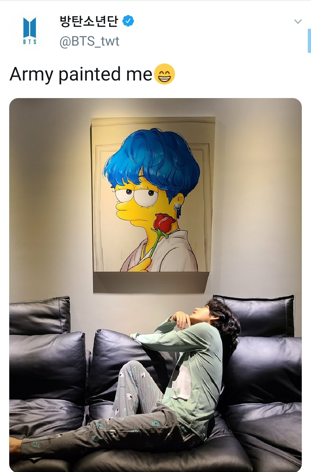 마침내 뷔가 액자로 만들겠다고 한 그림이 공개됐다. 25일 방탄소년단 공식 트위터에 뷔는 "Army painted me(아미가 나를 그렸다)"라는 글과 함께 한 장의 사진을 게재했다. 뷔는 소파에 편하게 기대서 팬이 그린 ‘뷔심슨’ 그림을 보고 있었다.