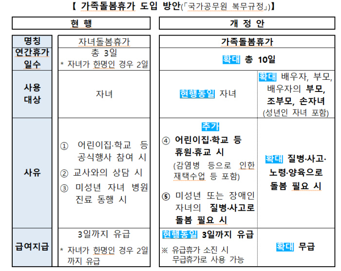 인사처는 현재 운영중인 공무원 자녀돌봄휴가를 가족돌봄휴가로 통합하고, 돌봄대상을 ‘자녀’에서 ‘가족’으로 확대하기로 했다. ‘가족’엔 자녀와 함께 배우자, 부모, 배우자 부모, 조부모, 손자녀가 포함된다. 개정안은 민간 부문과 동일하게 가족의 질병·사고·노령·양육 등을 위한 무급휴가 사용을 연 10일까지 허용한다. 자녀 돌봄의 경우 현행처럼 최대 3일간은 유급휴가를 적용한다.