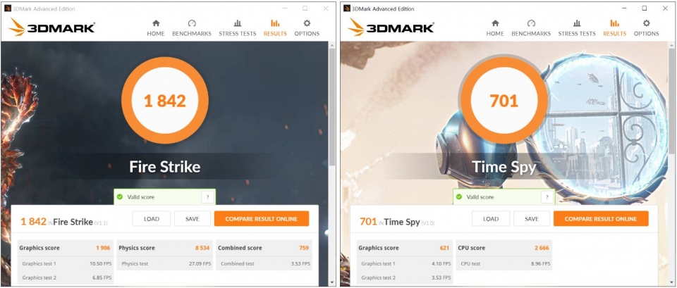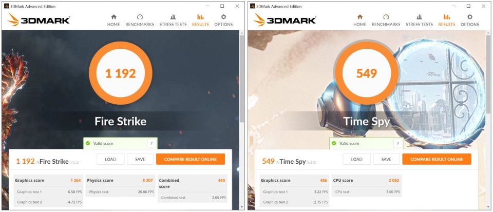 벤치마크 결과, 파이어 스트라이크는 그래픽스코어가 1264점, 타임 스파이는 486점으로 측정됐다.