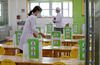 유치원 등원을 하루 앞둔 지난 26일 오후 충남 아산 배방유치원에서 시설 관계자가 급식실 칸막이를 점검하고 있다. 연합뉴스 |
