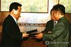김대중 대통령과 김정일 북한 국방위원장이 2000년 6월 14일 밤 백화원 영빈관에서 남북정상간 합의문을 교환하고 있다. 연합뉴스 자료사진 |