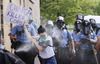미국 미네소타주 미니애폴리스 경찰서 앞에서 27일(현지시각) “살인마 경찰을 기소하라”는 손팻말을 들고 항의하는 시위대를 향해 진압 경찰이 최루액을 뿌리고 있다. 지난 25일 흑인 남성 조지 플로이드가 경찰의 과잉 진압으로 사망한 사건이 알려진 이후, 이곳에선 분노한 시민들의 항의 시위가 이틀째 이어졌다. 미니애폴리스/EPA 연합뉴스 |