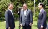문재인 대통령이 지난 28일 청와대에서 김태년 더불어민주당 원내대표, 주호영 미래통합당 원내대표와 이야기를 나누고 있다. 청와대사진기자단 |