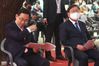 30일 종로구 조계사에서 열린 부처님오신날 법요식에서 더불어민주당 김태년 원내대표(오른쪽)와 미래통합당 주호영 원내대표가 나란히 앉아 있다. 연합뉴스 |