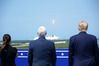 첫 민간 유인 우주선 발사에다 9년 만에 미국 땅에서 미국 우주선이 발사된 30일(현지시간) 도널드 트럼프 대통령(오른쪽부터)과 마크 펜스 부통령, 그의 부인 카렌 펜스가 마이크로X의 유인 우주 로켓 팰컨 9이 크루 드래건 우주 캡슐을 장착한 채 하늘로 솟구쳐 날아가는 모습을 올려다 보고 있다.케이프 커내버럴 AFP 연합뉴스 |
