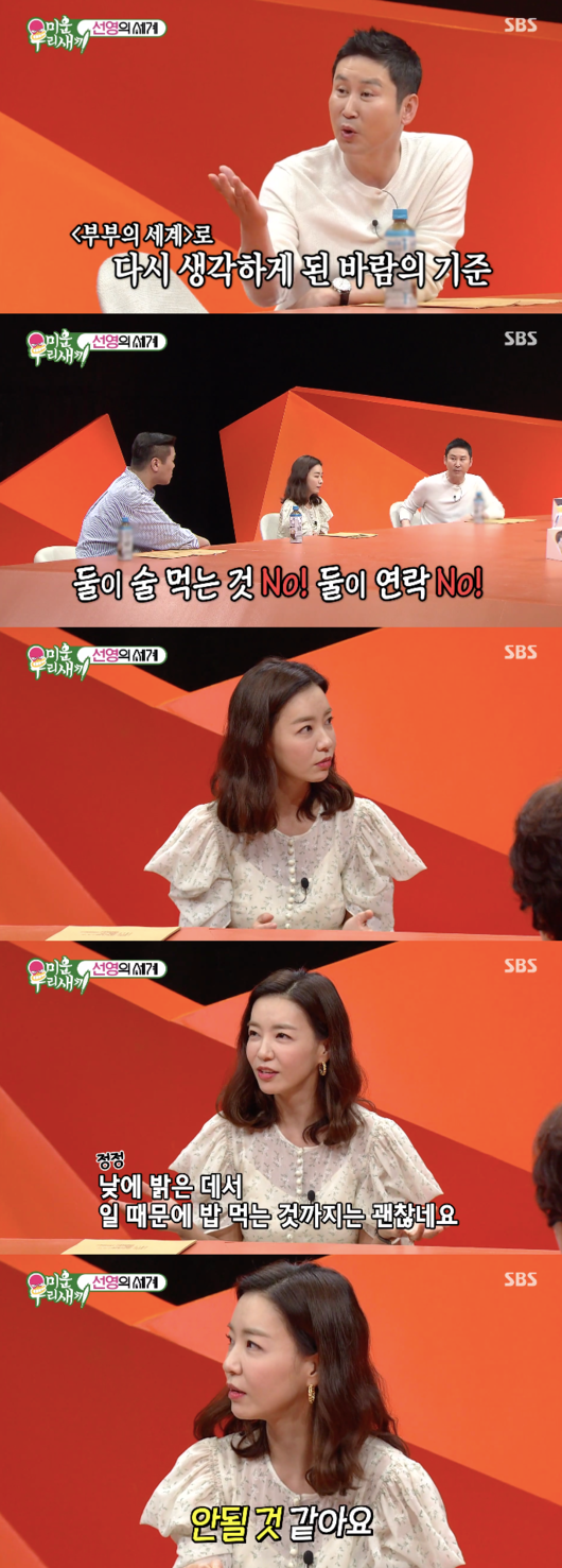 이에 박선영은 “낮에 밝은 데서 일 때문에 밥 먹는 것 까지는 괜찮다”며 “그 이상은 좀, 낮에 낮술은 안 될 것 같다”고 덧붙였다.