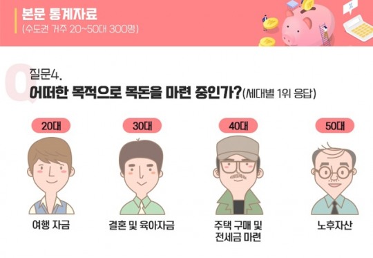 설문조사 결과에 따르면, 참여인원 중 절반을 훨씬 넘는 83%의 응답자가 현재 목돈을 마련 중인 것으로 나타났다. 또한 이들 중 76%는 목돈 마련을 위해 은행의 예금과 적금 상품을 활용하고 있다고 답했다. 세대별로 목돈을 모으는 이유 또한 다양했다. 주로 20대는 여행자금 충당, 30대는 결혼 및 육아 자금, 50대는 노후 자산 형성이 목적인 것으로 나타났다. 여기서 주목할 점은 대다수의 사람들이 목돈을 모으기 위해 예ㆍ적금을 활용한다는 것이다.