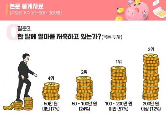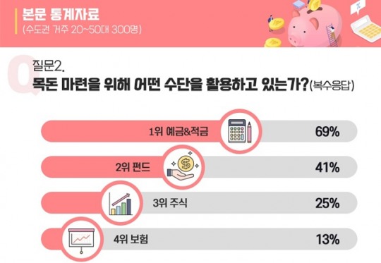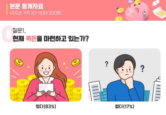 그렇다면 목돈 마련에 대한 사람들의 생각은 어떨까? 또 어떤 방법으로 목돈 마련을 준비하고 있을까? 금융 콘텐츠 플랫폼 한국금융콘텐츠연구소는 목돈 마련에 대한 사람들의 생각을 알아보기 위해 수도권에 거주하는 20~50대 300명을 대상으로 설문조사를 진행했다.
