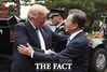 청와대는 2일 트럼프 대통령이 G7 외 4개국(한국·러시아·호주·일본) 등으로 참여국 확대 의사를 밝힌 뒤 문재인 대통령에게 가장 먼저 전화를 걸어왔다고 의미를 부여했다. 사진은 2017년 11월 청와대에서 국빈 방한한 도널드 트럼프 미국 대통령과 인사를 나누는 문 대통령. /청와대 제공 |