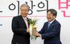 강기정(오른쪽) 청와대 정무수석이 2일 오후 서울 여의도 국회의사당을 방문해 김종인 미래통합당 비상대책위원장에게 문재인 대통령이 보낸 취임 축하 화분을 전달하고 있다./뉴시스 |