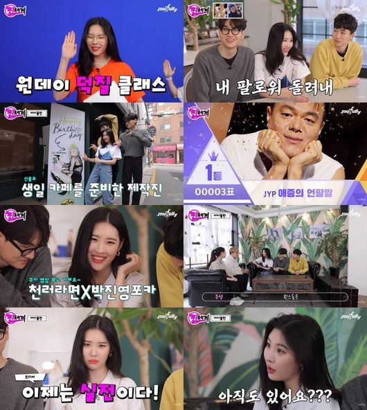 이어 실전반으로 넘어가 아이돌 덕질을 해보는 시간이 시작됐다. 덕질할 연예인을 고르기 위해 만들어진 돌림판에는 선미와 인연이 깊은 박진영(JYP) 프로듀서의 이름만이 적혀있었고, 이를 알아챈 선미와 동생들은 답정너(답은 정해져 있고 너는 대답만 하면 돼)아니냐며 원망해 귀여운 매력에 웃음이 그려졌다. 결국 박진영 프로듀서의 찐팬 도전이 결정됐고, 박진영의 레전드짤 101장 중 원픽을 가려내는 ‘진영듀스101’이라는 랜선 덕질 미션을 시도, 질색팔색하는 삼남매의 반응이 공감돼 재미를 더했다.