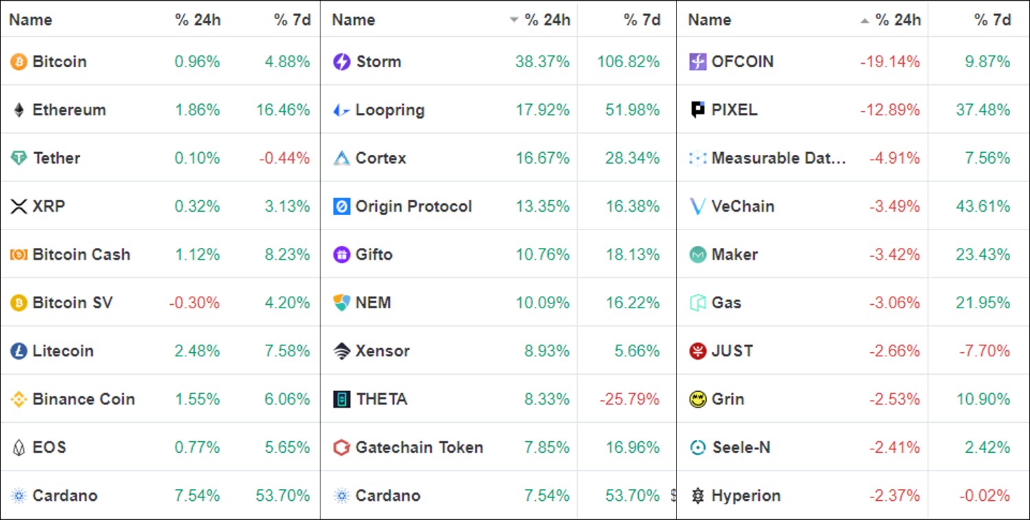 전일 시가총액 상위 코인 중에서는 카다노(ADA)가 +4.01%로 가장 높은 상승률을 보였으며, 바이낸스코인(BNB)이 +0.14%로 가장 적은 상승률을 보였습니다.